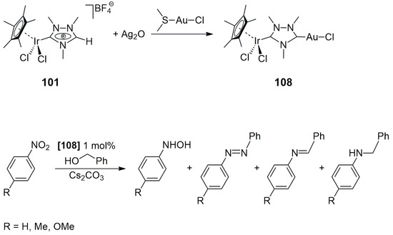 - Böhmer, M.; Kampert, F.; Tan, T.T.Y.; Guisado-Barrios, G.; Peris, E.; Hahn, F.E. IrIII/AuI and RhIII/AuI Heterobimetallic Complexes as Catalysts for the Coupling of Nitrobenzene and Benzylic Alcohol. Organometallics 2018, 37, 4092–4099. [Google Scholar] [CrossRef]