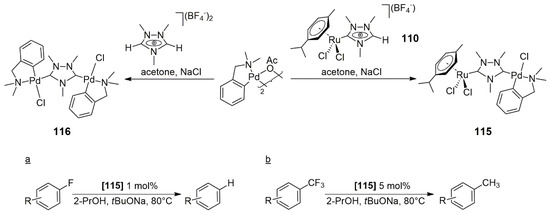 So far, the studied catalytic processes covered only a relatively narrow field of tandem or consecutive synthetic transformations, such as the tandem dehalogenation/transfer hydrogenation of bromoacetophenones in 2-propanol solutions or the Suzuki–Miyaura C–C coupling of brominated aromatic ketones or aldehydes, followed by transfer hydrogenation (in 2-PrOH) or α-alkylation (in nBuOH). Perhaps the most fascinating finding was the easy defluorination of fluorobenzol (and its derivatives) and α,α,α-trifluorotoluene catalyzed by a Ru/Pd heterobimetallic complex (115) of the 1,2,4-trimethyltriazole-diylidene (ditz) ligand under mild conditions. These reactions clearly show the power of metal–metal cooperativity in a heterobimetallic dicarbene complex, for example, in breaking up aromatic and aliphatic C-F bonds, among the strongest ones in organic chemistry. The relatively low number of catalytic reactions investigated with the use of bimetallic NHC catalysts is partly due to the requirement for the high stability of both M-C(carbene) and M′-C(carbene) bonds in the same molecule under the conditions required for the tandem processes. However, since a large number of bimetallic NHC complexes obtained so far have not been applied to catalysis, it can be expected that the number of synthetic procedures with such catalysts will increase in the future.