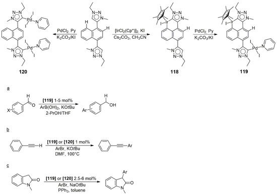 Synthesis of the heterobimetallic Ir/Pd bis(triazolylidene) complex 119 and its use as catalyst in (a) Suzuki-Miyaura C–C coupling of aromatic aldehydes and phenylboronic acids, (b) Sonogashira C–C coupling of phenylacetylene and bromoarenes, (c) arylation of oxindole with 2-bromotoluene.