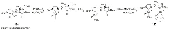 Synthesis of the heterobimetallic Pd/Rh complex 125 containing linked imidazolylidene/triazolylidene units in the ligand.