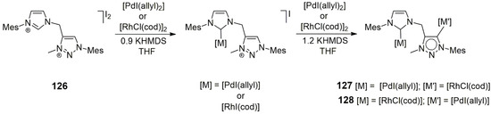 As part of a more general approach, Mendoza-Espinoza et al. synthesized the methylene-linked imidazolium-triazolium dicationic bis-carbene precursor 126 in a copper-catalyzed click reaction of 1-mesityl-3-alkynylimidazole and mesityl azide. The deprotonation of 126 with slightly less than equimolar KHMDS (K-hexamethyldisilazane), followed by the addition of [PdCl2(allyl)]2 or [Rh(μ-Cl)(cod)]2, resulted in Pd or Rh metalation, respectively, on the imidazole C2, leaving the triazolium part available for subsequent reactions. Indeed, the further reaction of this intermediate with [PdCl2(allyl)]2 or [Rh(μ-Cl)(cod)]2 supplied the bimetallic NHC/MIC complex 127 or 128, in which the bonding of the metal ions to NHC carbene or 1,2,3-triazolyl carbene atoms depended on the order of addition of the Pd and Rh complexes (Scheme 44) [66]. All complexes were fully characterized by NMR methods; however, attempts to obtain single crystals of 127 and 128 were unsuccessful. Possible catalytic uses of the heterobimetallic NHC/MIC complexes were mentioned in the paper; however, no such reactions were described.