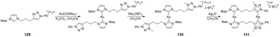The heterobimetallic complex 131 was not prepared directly from 130. Instead, the bis-NHC-Au complex of 129 was methylated with the use of Me3OBF4 on the triazole ring. The further reaction of the product with Ag2O yielded the heterobimetallic Au/Ag complex 131, in which Au acts as a bride to the imidazolyl carbene atoms, while Ag forms a bridge between the triazolilydene carbene donor atoms (Scheme 45). No catalysis with this complex was reported.