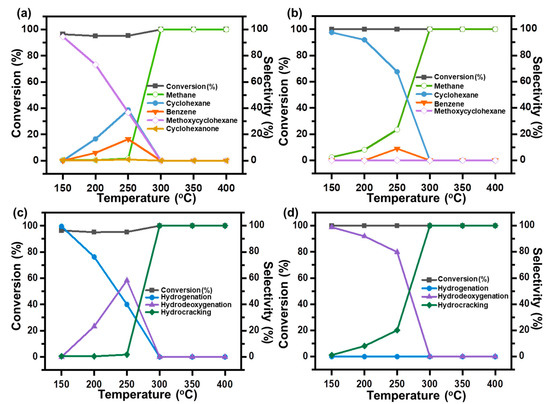 As shown in Figure 1c,d, reaction temperature has a different effect on the three different types of reactions: hydrogenation, HDO, and C-C hydrogenolysis. Firstly, at a low temperature (150 °C), their selectivity is completely different: C–reduced NiO is prone to following the hydrogenation route, while U–reduced NiO is more likely to undergo the HDO reaction. As temperature increases, the hydrogenation reaction of C–reduced NiO and the HDO reaction of U–reduced NiO are obviously inhibited; the reactions of both catalysts tend to take the C-C hydrogenolysis route. All feedstocks are transformed to methane at a temperature of 300 °C or higher.