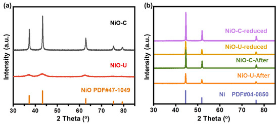 The crystalline structures of fresh catalysts were examined. The fresh catalysts both exhibit the same diffraction peaks, which are assigned to NiO (PDF#47-1049), as shown in Figure 3a [32]. Moreover, the XRD pattern of NiO–C has a narrower peak width and higher peak intensity compared to NiO–U, indicating significant differences in the degree of crystallization and particle size between the two catalysts. NiO–C exhibits better crystallinity as compared to NiO–U. The particle sizes of the catalysts were calculated by the Scherrer formula and are shown in Table 1 [41]. It can be inferred that the crystal size of NiO–C is larger than that of NiO–U. The structure of the catalysts after pretreatment and reaction are further evaluated (Figure 3b), reveals that both catalysts are reduced to nickel (PDF#04-0850). The reduced and spent catalysts exhibit similar crystallinity and particle size [42].