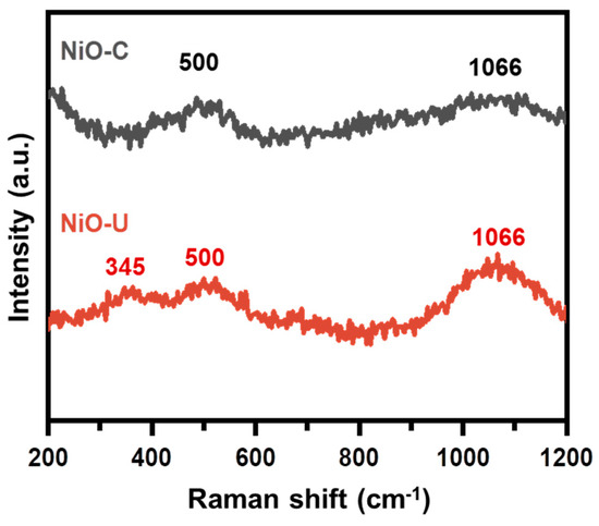 Raman spectra were used to investigate the metal state and structures of the fresh catalysts. As presented in Figure 4, it was found that the two NiO catalysts have similar Raman spectra. For NiO–U, the spectra show signal peaks at 345 cm−1, 500 cm−1, and 1066 cm−1, which correspond to the first-order phonon TO, the first-order phonon LO, and the second-order phonon 2LO of NiO crystals [43,44]. The existence of 1TO and 1LO modes in the Raman spectra suggests that Ni2+ and disordered oxygen may be present. This conclusion suggests that the catalysts are NiO materials, which is in agreement with the XRD (Figure 3) results. Similarly, for NiO–C, the peaks at 500 cm−1 and 1066 cm−1 correspond to the 1TO and 2LO signals of nickel oxide crystals. Combined with the above characterization data, the two catalysts are nickel oxide crystals before pretreatment.