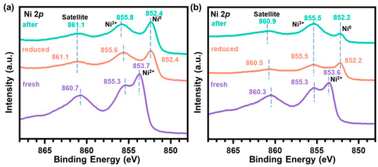 Surface elemental composition and valence of elements in NiO catalysts were analyzed through XPS spectra. Figure 6a shows the XPS spectra of NiO–C catalysts, including a fresh catalyst, pretreated catalyst, and spent catalyst. The fresh NiO–C catalyst shows two peaks at 853.7 and 855.3 eV, which are related to Ni2+ and Ni3+ ions, respectively. And the peak at 860.7 eV is attributed to a high-spin Ni 2p3/2 satellite [47,48]. It is worth noting that the existence of Ni3+ does not necessarily indicate the presence of Ni2O3 in the sample. According to other research, it has been reported that Ni2+ in NiO is more likely to generate defects, leading to the loss of an electron by the two neighboring Ni2+ and the production of Ni3+ on the NiO surface to preserve the charge balance [49].