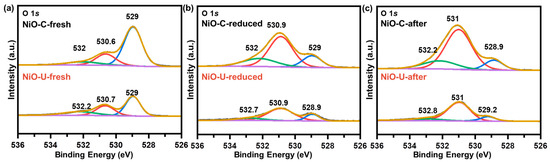 X-ray photoelectron spectroscopy (XPS) spectra of O 1s for NiO–C and NiO–U catalysts (a) before the reaction, (b) after reduction, and (c) after the reaction. The blue line represents lattice oxygen, red line is disordered oxygen and green line is hydroxyl oxygen.