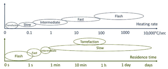 Heating rate and residence time for biomass using different thermochemical techniques. Slow: slow pyrolysis; fast: fast pyrolysis; intermediate: intermediate pyrolysis; flash: flash pyrolysis [9].