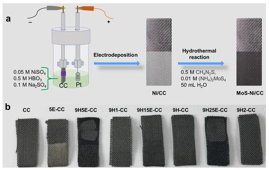 (a) Schematic illustration of the procedure for fabrication of MoO3-NiSx (9H5E-CC) electrode. (b) Photographic images of the CC substrate and the as-prepared samples.