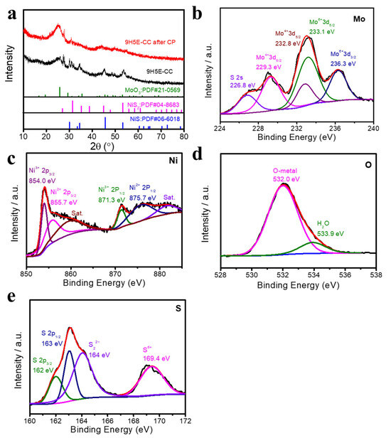 The oxidation states and chemical composition of 9H5E-CC: (a) XRD patterns. XPS analysis of (b) Mo, (c) Ni, (d) O, and (e) S.