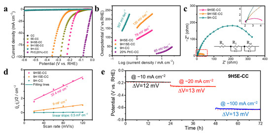 Electrocatalytic HER. (a) Polarization curves; (b) Tafel plot; (c) EIS; (d) current density differences (Δj = ja − jc) plotted against scan rate (20, 40, 60, 80, 100, and 120 mV/s); (e) long-term stability measurement of 9H5E-CC sample at −10, −20, and −100 mA cm−2 for each 24 h.
