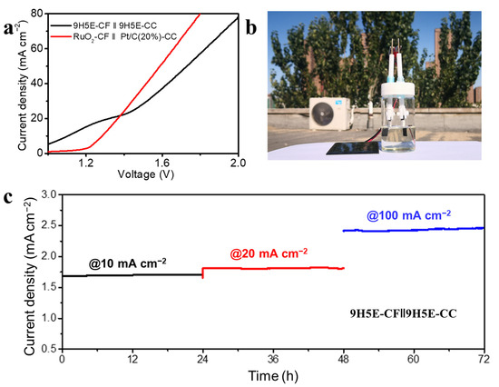 Overall water splitting activity of 9H5E-CF||9H5E-CC. (a) Polarization curves, (b) Photographic image of overall water splitting driven by a solar panel, (c) Long-term stability measurement at 10, 20, 100 mA cm−2 for each 24 h.
