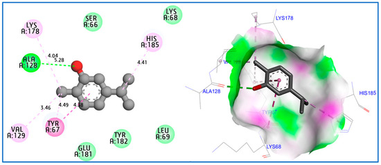 Two- and three-dimensional visualizations of intermolecular interactions shown in Figure 3 confirm that carvacrol (C2) and thymol (C3), as major compounds of the studied plant, were docked to antioxidant protein. Initially, C2 and C3 compounds were docked in the active sites of NADPH oxidase protein encoded as 2CDU.pdb with binding energies of −6.26 Kcal/mol and −5.83 Kcal/mol, respectively. Both compounds share a number of common intermolecular interactions such as the pi–sigma bond type with His10 amino acid and two hydrogen bonds with Leu299 and Asp282 amino acid residues. In addition, there are alkyl and pi–alkyl bonds with Ala11, Ala300, and Ala303 amino acid residues.