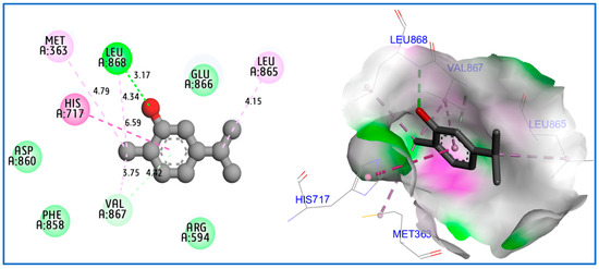 Lastly, the second antidiabetic protein of human lysosomal acid α-glucosidase, encoded as 5NN5.pdb, was reacted with carvacrol (C2) and thymol (C3) with binding energies of −5.29 Kcal/mol and −5.72 Kcal/mol, respectively. One hydrogen bond and one pi–pi T-shaped bond were detected for carvacrol towards Leu868 and His717 amino acid residues, respectively. Three hydrogen bonds were created between thymol and Glu866, Ser864, and Arg594 amino acid residues of the targeted protein in the A chain, as shown in Figure 5.