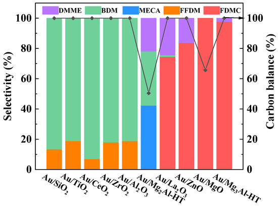 According to the catalytic results, the Mg3-Al1 hydrotalcite catalyst exhibits significantly higher CO2 and NH3 adsorption capacity. It is generally believed that the acidic site on the catalyst surface is conducive to the adsorption and polarization of aldehyde groups of DFF [24], further promoting the nucleophilic attack of methanol to form hemiacetal intermediates. In the presence of alkaline sites, hemiacetal intermediates are more inclined to bind with Au on the catalyst surface to promote the formation of esters [13]. Au/La2O3 showed a strong CO2 desorption signal above 600 °C but with a very weak NH3 adsorption capacity; the yield of FDMC is only 74.6%. Au/Mg2Al-HT, Au/MgO, and Au/ZnO had similar CO2 and NH3 desorption patterns, but these catalysts exhibited different catalytic activities. Au/Mg2Al-HT produced a large amount of acetal products (57.6%). Au/MgO led to a significant amount of carbon loss (34.3%). In contrast, Au/ZnO could obtain a FDMC yield of more than 80% (Figure 3). Based on these results, the number of medium and strong alkaline sites and appropriate acidic sites had an effect on catalyst activity in oxidative esterification.
