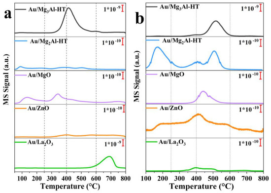 In order to characterize the strength of alkalinity on different supports, CO2-TPD analysis was carried out on the basic supported Au catalysts. In Figure 4a, Au/Mg3Al-HT shows the maximum desorption quantity of CO2 between 350 and 600 °C, and Au/La2O3 shows an obvious CO2 desorption signal between 600 and 800 °C. For Au/Mg2Al-HT, Au/MgO, and Au/ZnO, the temperature between 250 and 600 °C shows very weak signals. Corresponding to the different CO2 desorption temperatures, the basic sites on the catalyst surface can be divided into weak basic sites (<250 °C), medium basic sites (250–400 °C), strong basic sites (400–600 °C), and super basic sites (>600 °C) [22]. It is commonly acknowledged that the weakly basic site is provided by the -OH group on the surface of catalysts for the formation of hydrogen bonds, the medium basic site is provided by M-O pairs, and the strong basic site is from lattice oxygen [23]. Furthermore, considering the possible presence of acidic sites on the catalysts’ surface, we performed NH3-TPD to test these five catalysts. In Figure 4b, Au/Mg3Al-HT also shows the strongest NH3 desorption signal between 400 and 600 °C. For Au/Mg2Al-HT, Au/MgO, Au/ZnO, and Au/La2O3, they all show similar weak NH3 signals.
