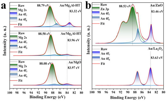 XPS spectra of (a) Au/Mg3Al-HT, Au/Mg2Al-HT, and Au/MgO; (b) Au/ZnO and Au/La2O3.
