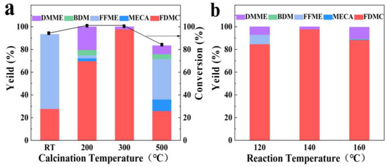 (a) Oxidative esterification of DFF on Au/Mg3Al-HT catalyst with different calcination temperatures, (b) Oxidative esterification of DFF at different reaction temperatures using Au/Mg3Al-HT catalyst.