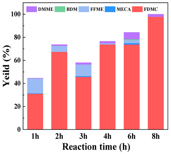 We plotted the reaction time curve of DFF oxidative esterification on Au/Mg3Al-HT catalysts by collecting the reaction products at different reaction stages (Figure 8). After 1 h of reaction, the yield of FDMC was 31.1%, with 95.7% conversion of DFF. DFF can be completely transformed by prolonging the reaction time. The yield of FDMC showed a slight decrease after 3 h, and then FDMC gradually increased with the extension of time. During the reaction, the yield of detectable by-products was always maintained below 20%. After 8 h of reaction, DMME was the only by-product, with a yield of 2.22%. Based on the reaction time curve, we proposed a possible reaction mechanism in the oxidative esterification of DFF under Au/Mg3Al-HT catalysis. DFF was easily adsorbed and activated on the electron-rich surface of the catalyst, and 5-formylfuran-2-carboxylic acid (FFCA) was obtained at first. After that, FFCA was catalyzed to form FFME through oxidative esterification. The further oxidative esterification of FFME is easier than that of the unilateral aldehyde group of DFF, which makes FFME easy to convert further into FDMC.