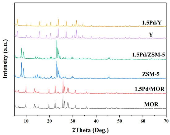 Zeolites have a high surface area and high stability due to their porous and crystalline structure. So the zeolites gain much attention from researchers in the field of heterogeneous catalysts. Keeping the zeolitic structure unbroken is essential for the synthesis of zeolites as catalysts. The X-ray diffraction patterns (XRD) of the prepared Pd-based catalysts and the parent zeolites are shown in Figure 1. The catalysts of 1.5 Pd/Y, 1.5 Pd/ZSM-5, and 1.5 Pd/MOR show typical FAU, MFI, and MOR topological structures, respectively. Meanwhile, compared to the XRD of parent zeolites, no obvious change was observed in the XRD patterns of 1.5 Pd/Y, 1.5 Pd/ZSM-5, and 1.5 Pd/MOR. These results mean that the synthesis processes did not destroy the crystalline structure of the zeolites [24,33,34,35], although NaOH was used as a catalyst for condensation reactions in the preparation of the catalysts. To study the chemical composition of the zeolites after loading Pd, the inductively coupled plasma spectrometer (ICP) method was applied to determine the n(Si)/n(Al) of the samples (Table 1). It can be seen that the n(Si)/n(Al) value of the sample after loading of Pd is close to that of the parent zeolite. In the synthesis process, the concentration of the NaOH solution applied as the condensation catalyst is only ~0.5 wt%; meanwhile, this process was conducted at room temperature. Thus, no significant difference in the chemical composition of the zeolites is reasonable. This is consistent with the XRD results. Meanwhile, it is reported that the characteristic diffraction peak of the Pd (111) plane should be located at 2θ = 40.1° [36]. However, no apparent peak corresponding to Pd (111) can be observed even in the enlarged figure. This might be caused by the small and uniform Pd particles. ICP results confirmed the presence of Pd in the catalyst. For 1.5 Pd/Y, 1.5 Pd/ZSM-5, and 1.5 Pd/MOR, the Pd loadings tested by ICP were 1.43 wt%, 1.36 wt%, and 1.39 wt%, respectively (Table 1). Based on the theoretical value (1.5 wt%), it can be concluded that more than 90% of the Pd was successfully introduced into these zeolitic catalysts. Thus, the absence of a diffraction peak of Pd in XRD results implies the presence of small and uniform Pd particles in the catalysts. Otherwise, surface area and pore volume were measured and listed in Table 1. All the prepared Pd-containing catalysts show high surface area and pore volume, and this is caused by the porous structure of the zeolites. Compared with supports (Y, ZSM-5, MOR), prepared catalysts (1.5 Pd/Y, 1.5 Pd/ZSM-5, and 1.5 Pd/MOR) have a lower surface area and pore volume, implying the successful loading of Pd, which can block some pores in the zeolite.