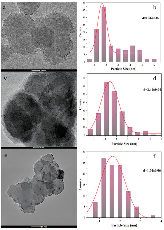 TEM images and particle size distributions of 1.5 Pd/Y (a,b), 1.5 Pd/MOR (c,d), and 1.5 Pd/ZSM-5 (e,f).