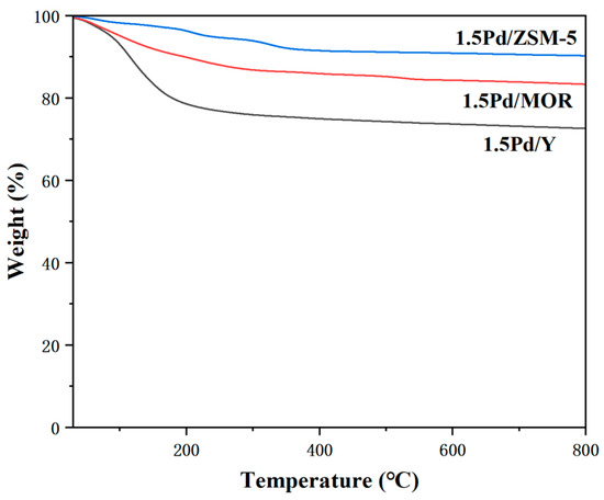 TG results can give some information about the organic residue in the catalysts. As shown in Figure 5, for all these catalysts, the weight loss mainly occurred in the temperature range of 50–200 °C. The weight loss in this region was caused by the removal of water, and some organic residues were not removed by washing in the synthesis of the Pd-based catalysts. Obvious weight losses were observed in the TG curves of Pd/ZSM-5, Pd/MOR, and Pd/Y, indicating the existence of some organic residue in the prepared catalyst. These residues were adsorbed into the structure of the zeolites. The washing process cannot remove it completely. Meanwhile, the adsorption strengths of the residues in the three zeolites are different, leading to a different weight loss ratio. This might be related to the differences in the microenvironment of these zeolites. Fortunately, these prepared catalysts still show high catalytic performance, although some residue exists in the catalyst. This encourages us to do more work to remove the residue to further enhance the catalytic performance of these catalysts in the future.