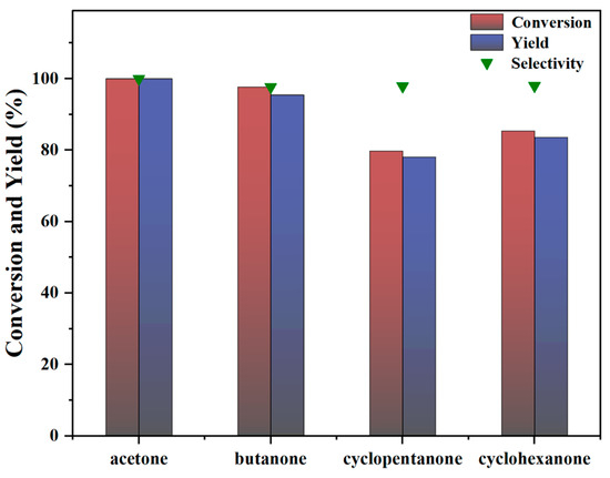 As mentioned above, ketones were applied for the in-situ synthesis of reductant, which is essential for the reduction of PdCl2 to Pd0. Ketones, including acetone, butanone, cyclopentenone, and cyclohexanone, were used to study the effect of ketone types on the catalytic performance of the catalyst. As shown in Figure 8, when acetone and butanone were applied to synthesize the reductant, the prepared catalyst showed high catalytic activity (~100% nitrobenzene conversion). However, lower catalytic activities were observed when cyclopentenone and cyclohexanone were used. This is related to the molecular structure of the ketones. Acetone and butanone have chain-type molecular structures, while cyclopentenone and cyclohexanone have cyclic structures. For the introduction of reductant into the zeolite, condensation products derived from chain-type ketones have a smaller steric hindrance than those from cyclic ketones. Thus, the reductant based on chain-type ketones can realize the reduction of Pd2+ to Pd0 in zeolite more efficiently than that based on cyclic ketones, leading to the higher catalytic activity of the catalyst synthesized with the former reductants. Otherwise, the types of ketones do not influence the product selectivity. All the synthesized catalysts based on different ketones show ~100% aniline selectivity.