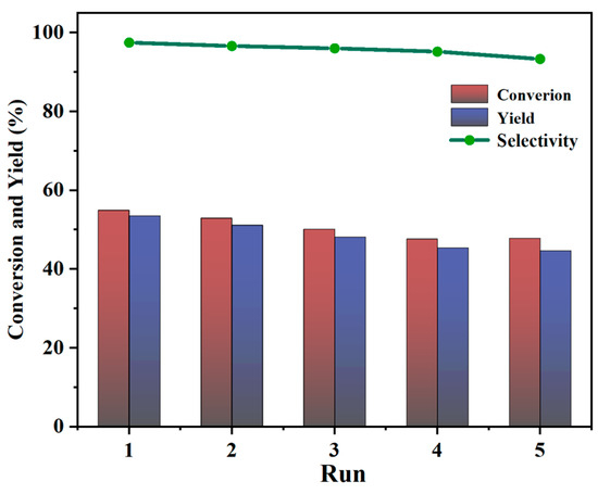Stability and recyclability are important for the industrial application of heterogeneous catalysts. Thus, the stability and recyclability of the prepared catalyst were tested. The results are shown in Figure 9. To reveal the real stability of the catalyst, the complete conversion of the reactant should be avoided. Thus, a reaction time of 35 min was selected. In the test, the catalyst separated from the reaction solution was directly used in the next run after drying. Slight decreases in conversion and selectivity were observed after each run. The XRD patterns of the fresh catalyst and the catalyst after the fifth run are shown in Figure 10. After several runs, the intensity of the XRD peaks became lower. This might be caused by the basicity of the product of aniline. It can damage the crystalline structure of the zeolite to some degree. Otherwise, the 2.0 Pd/Y catalyst kept the crystalline structure of the Y zeolite after 5 runs, indicating the acceptable stability of the catalyst. These results imply that the zeolite-supported Pd catalyst synthesized by the novel strategy developed in this work has industrial application potential.