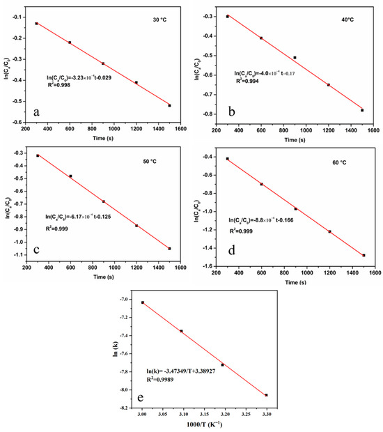 The kinetic study can provide some basic parameters for the design of a reactor on an industrial scale-up. In this work, kinetic analysis was conducted by collecting the time course of the reaction at 30, 40, 50, and 60 °C. The initial concentration of nitrobenzene and the concentration of nitrobenzene at a definite reaction time were denoted as c0 and ca, respectively. As shown in Figure 11a–d, the linear relationship between ln(ca/c0) and reaction time indicates that this is a first-order reaction. Figure 11e shows the Arrhenius plot for the hydrogenation of nitrobenzene over 2.0 Pa/Y. The apparent activation energy (Ea) calculated by a linear fitting method is 28.88 kJ mol−1, which is lower than most of the reported values in the literature [48], implying the higher catalytic activity of the catalyst developed in this work. Meanwhile, according to the line intercept in Figure 11e, the pre-exponential factor (A) was determined to be 29.64 s−1. Thus, the Arrhenius equation for hydrogenation of nitrobenzene over 2.0 Pd/Y can be expressed as: k = 29.64 exp(−3473.79/T).
