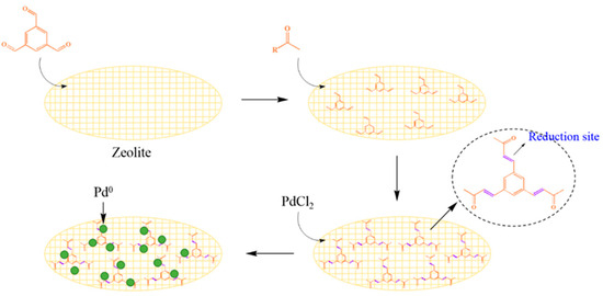 As reported in our previous work, the C=C group can realize the reduction of Pd2+ to Pd0 through the Wacker reaction [39,40]. When palladium chloride reacted with cyclohexene in an aqueous solution, palladium black was obtained, and the generation of cyclohexanone was detected [40]. By using a base as a catalyst, chemicals with C=C groups can be synthesized by aldol condensation. Thus, in this work, a reducing agent containing C=C groups was in-situ synthesized by aldol condensation between 1,3,5-triformylbenzene and ketone (such as acetone) in the preparation of the catalyst. Based on the characterization results discussed above, the synthesis scheme for zeolites supported by Pd is proposed (Scheme 1). Firstly, 1,3,5-triformylbenzene was introduced into the zeolite uniformly by an impregnation method. Then, ketone solutions and bases (such as NaOH) were added. The base acts as the catalyst in the aldol condensation reaction between 1,3,5-triformylbenzene and ketone. After reacting for a desired time, the aldol condensation product with C=C groups formed uniformly in the zeolite. The C=C group in the condensation product has reduction ability. When PdCl2 is loaded, the Pd2+ can be reduced to Pd0 on these C=C sites in the presence of water through a partial Wacker reaction. The uniform dispersion of the in-situ-formed reducing agent on zeolite can ensure the formation of small and uniform Pd0 nanoparticles, which provide highly active sites for various hydrogenation reactions. This is a novel, easy, and efficient strategy for the synthesis of zeolites supported by Pd catalysts. This method can also be applied to the synthesis of other supported noble metal catalysts.