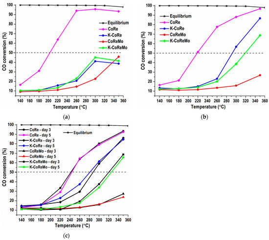 A comparative assessment was carried out by applying the criteria for the maximum sensitivity of an activity measurement of around a 50% conversion, as this is more informative about a catalyst’s performance [37,38]. The behavior of the CoRe catalyst was characterized through raising the reaction temperature at a 50% CO conversion by 16 grad to 219 °C on the second testing day (Figure 6a,b). During day 3 (Figure 6c), the conversion degree was moved to a higher temperature of 240 °C by 21 grad, thus a slight deactivation of the CoRe system was confirmed. The potassium-promoted K-CoRe and K-CoReMo catalysts (Figure 6a–c) achieved a 50% conversion at 292 and 318 °C during the second testing day, respectively. The same happened on day 3: 287 °C for K-CoRe and 320 °C with K-CoReMo. It should be noted that the temperature at which there was a 50% conversion for K-CoRe dropped by 5 grad. Obviously, the observed tendency towards higher activity in the 180–260 °C interval should not be considered an experimental error. This statement clearly indicates an elaboration of the K-CoRe system during the testing period. Under this condition, only the CoReMo configuration did not reach a 50% CO conversion.