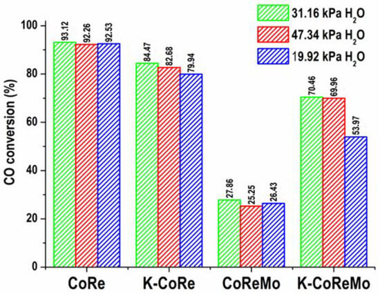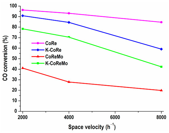 - The second step in the express estimation of the deactivation behavior included extreme conditions of a high GHSV, as 2000 > 4000 > 8000 h−1 (Figure 8). Increasing the space velocity to 8000 h−1 did not greatly affect the CoRe activity (only by 9%), while the CO conversion of the K-CoRe and K-CoReMo samples was diminished by 30% and 40%, respectively. The relative stability of CoReMo was noticeable because a two-fold change increase to 8000 h−1 did not cause complete inactivity. This composition was relatively less active but manifested a decrease in the CO conversion level to the same extent of 29%.