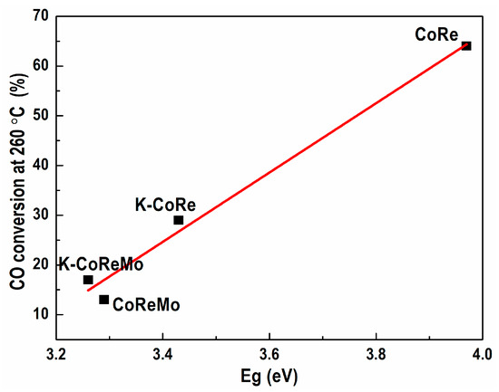The CO conversion degree at 260 °C was selected for the activity evaluation. Under this condition, on the one hand, the differences between the catalyst composition and conversion were more pronounced. On the other hand, the mass transfer processes are determinative because of a specific feature of the WGS reaction. From this connection, a correlation between the Eg and catalyst activity was found, as displayed in Figure 9. The latter reveals that the particle size of the supported oxide phase affects the performance of the (K)CoRe and (K)CoReMo catalysts. In addition, the reported band gap energy diminution with an increasing number of components reflects changes in the electronic properties of the multicomponent catalysts. When the dopant density is high, dopant states generate a band close to the valence or conduction band edge, which ultimately decreases the band gap. The band gap value drops upon the addition of potassium and molybdenum, showing a strong metal–support electronic interaction. The working structures should be a combination of the three redox couples of metal oxides like the Re4+–Re7+, Co2+–Co3+, and Mo4+–Mo6+ structures, thus assuming that the initial electronic properties may affect the catalytic ability in the WGS reaction.