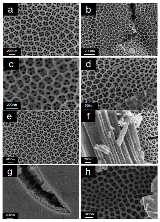 SEM: (a) TiO2 nanotubes produced via two-step oxidation; (b–h) Au/TiO2 nanotubes in doping amounts of 0.2, 0.3, 0.4, 0.5, 0.6, 0.7, and 0.8 g/L Au.