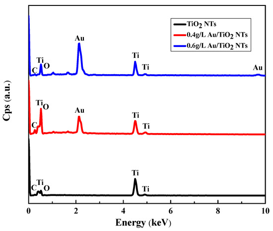 In the case of the Au/TiO2 nanotubes, they corresponded to the mixture phase and exhibited no significant differences from pristine TiO2 nanotubes. The peaks at 2 theta values of 38.21°, 44.32°, and 63.80° match the (111), (200), and (220) planes [27] of the Au phase in the patterns (JCPDS 65-2870), confirming the presence of metallic Au. Further analyses, in combination with SEM and EDS, can demonstrate the successful preparation of Au/TiO2 nanotubes.
