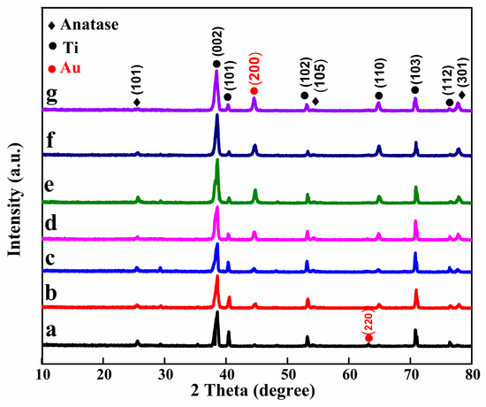 XRD patterns of (a) TiO2 NTs; (b) 0.2 g/L Au@TiO2 NTs; (c) 0.3 g/L Au@TiO2 NTs; (d) 0.4 g/L Au@TiO2 NTs; (e) 0.5 g/L Au@TiO2 NTs; (f) 0.6 g/L Au@TiO2 NTs; (g) 0.7 g/L Au@TiO2 NTs.