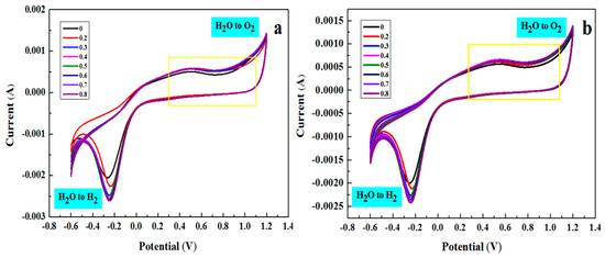 To investigate the impact of ultraviolet (UV) light and gold concentrations on nitrobenzene degradation, cyclic voltammetry curves of the nitrobenzene solution were examined before and after UV light exposure. A conventional three-electrode system was employed in the experiment, with Au/TiO2 nanotubes serving as the photoanode, Pt serving as the photocathode, and Ag/AgCl acting as the reference electrode. To emphasize the nitrobenzene characteristic peak, a high electrolyte concentration (1 g/L nitrobenzene) and 15 g/L of Na2SO4 serving as the supporting electrolyte were employed. In the experiment, a UV lamp was used as a light source, and the scanning rate was 50 mV/s during the whole experiment. The volt–ampere characteristic curve of the nitrobenzene solution was analyzed under the condition of avoiding light, and the detection results are shown in Figure 4a. The cyclic voltammetry curve of the nitrobenzene solution was analyzed under ultraviolet light, and the detection results are shown in Figure 4b. As can be seen from the two figures, the cyclic voltammetry curve of nitrobenzene is regular under the two conditions; only one obvious oxidation peak was detected in the positive direction of the scanning of nitrobenzene on each oxidation curve, and likewise, only one reduction peak was detected in a negative direction. This means that in this mode, nitrobenzene was oxidized in only one step. Upon comparing the two figures, it is evident that the oxidation and reduction peaks obtained with the Au/TiO2 nanotubes loaded with Au were significantly higher than those of the two-step TiO2 nanotubes. In comparison to the TiO2 nanotubes, the chemical reaction was more pronounced under Au/TiO2 nanotube conditions, making nitrobenzene more susceptible to oxidation. A comparison of the two figures reveals that the area under the cyclic voltammetry curve of nitrobenzene exposed to UV light was significantly larger than that under dark conditions, indicating a more intense chemical reaction under UV light, facilitating nitrobenzene oxidation.