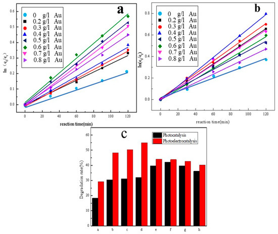 The photocatalytic and photoelectrocatalytic performance bestowed by the Au loading on the TiO2 nanotubes were estimated via the degradation of nitrobenzene solution, a refractory organic wastewater, under room-temperature. The degradation rate curve of nitrobenzene fundamentally corresponded to the first-order kinetic equation (lnC0/Ct = kat) in photocatalysis and photoelectrocatalysis, as shown in Figure 6a,b. Significantly, ka increased gradually with the increase in the Au loading, and ka decreased as the Au loading continued to increase. The degradation rates of the nitrobenzene solution with different concentrations are summarized in Figure 6c.
