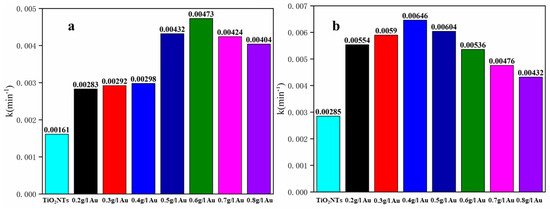 By analyzing the degradation trend depicted in Figure 7, the rate constant can be determined. As shown in Figure 7a, the degradation rate for the 0.6 g/L Au/TiO2 nanotubes was approximately three times higher than that of the TiO2 nanotubes. Adjusting the Au concentration could enhance the chemical reaction, leading to more effective separation of holes and electrons. In comparison to photocatalysis, the reaction rate was significantly higher with photo-electro coupling. This can be attributed to the presence of more carriers, which, in turn, stimulated more reactions with the target degradation substance.