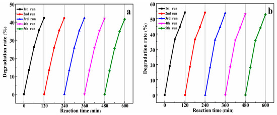 Maintaining stability in production is crucial for applications. Consequently, the stability of various Au loadings was tested under both PC and PEC conditions, as illustrated in Figure 8. The performance of the modified TiO2 nanotubes was assessed by subjecting the sample to five degradation cycles. The graphs clearly demonstrate that the degradation rate of the sample remained nearly constant, indicating the excellent reusability and stability of the photocatalyst.