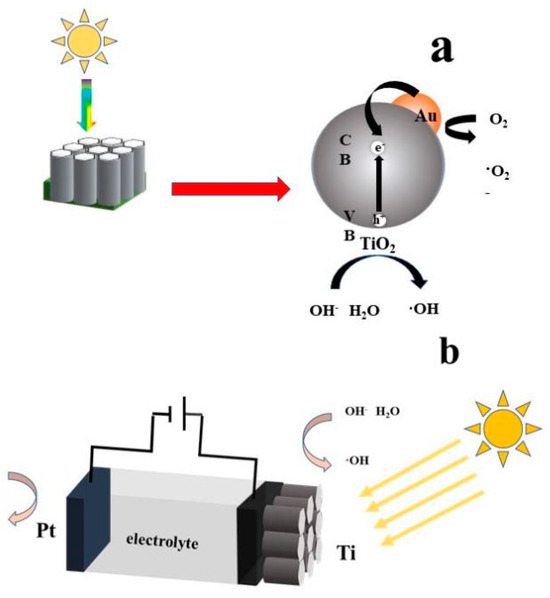 The mechanism of Au/TiO2 nanotubes under (a) photo and (b) photo-electro co-induction.