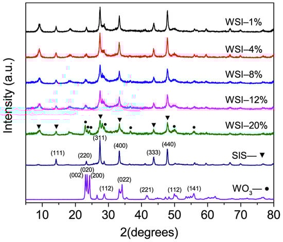 The XRD patterns of the as-prepared samples showed a high degree of crystallinity, as shown in Figure 1. The distinct peaks of bare SIS at 14.3°, 23.4°, 27.5°, 33.3°, 43.7°, and 47.8° could be ascribed to (111), (220), (311), (400), (333), and (440) crystal planes of cubic SIS (JCPDS card # 42-1305, a = b = c = 10.7507 Å), which is consistent with a previous report on the crystal planes of cubic SIS [26]. In addition, the XRD patterns of the pure WO3 are perfectly ascribed to the monoclinic phase of WO3 (JCPDS card # 43-1035, a = 7.297 Å, b = 7.539 Å, c = 7.688 Å), which exhibits higher photocatalytic activity and is more stable than the orthorhombic and hexagonal phase [13]. Generally, the intensity of diffraction peaks is proportional to the amount of each phase present. In the present study, the characteristic peaks of WSI heterojunction are well consistent with the pattern of pure SIS. Compared with the peaks of SIS, the peak intensity of WO3 is relatively weak owing to the low proportion of WO3 in the heterojunction. No characteristic peaks of other impurities were observed, indicating that the WSI heterojunction was successfully prepared. Importantly, all diffraction peaks of SIS remain unchanged in their position and intensity after integration with WO3 via hydrothermal synthesis, demonstrating that the introduction of WO3 does not alter the crystal structure of SIS.