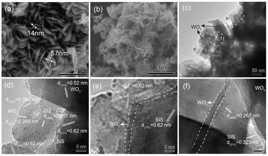 SEM images of (a) WO3 and (b) WSI photocatalyst, (c–f) HRTEM image of WSI-12% photocatalyst.