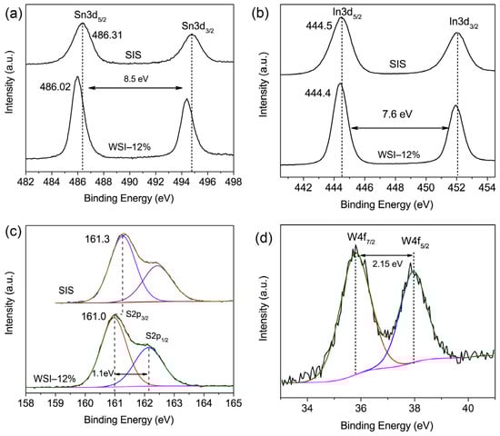 The chemical states of SIS and the WSI-12% heterostructure were investigated by XPS analysis, as shown in Figure 3. The high-resolution Sn 3d and In 3d spectrum exhibit two peaks, 3d5/2 and 3d3/2, with spin-orbital splittings of 8.5 eV and 7.6 eV, respectively, indicating that the valence states in the composite are Sn4+ and In3+ [28,29]. The binding energy of Sn 3d in the WSI-12% heterostructure decreases compared with SIS, due to the electronegativity of oxygen atoms boned to Sn4+ after integration of WO3. Similarly, the binding energy of In 3d in the WSI-12% heterostructure shifts from 444.5 eV to 444.4 eV under the influence of oxygen atoms in WO3, as observed in ZnIn2S4/TiO2, where the binding energy of In 3d is influenced by TiO2 [30]. The S 2p spectrum shows a broad spectrum with a hump at higher binding energy, which is divided into two peaks, assigned to 2p3/2 and 2p1/2, respectively. The spin-orbital splitting of S 2p in the composites is 1.1 eV, indicating that the oxidation state of S is −2. Compared to S 2p in SIS and WSI-12%, the decrease of the binding energy is obvious under the influence of the W and O atoms, due to the increase in electron density of the S atom. Moreover, the peak area ratios and the spin-orbital splitting are 1.3 and 2.15 eV, respectively, indicating that the chemical state of W 4f in the composite is W6+ [31].
