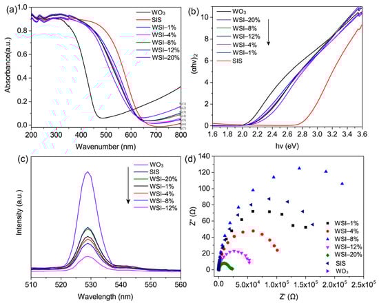 Electrochemical Impedance Spectroscopy (EIS) of the photocatalysts was measured to further investigate the photogenerated electron transfer efficiency. It is reported that the smaller arc radius implies better conductivity and higher electron transfer efficiency [34]. As shown in Figure 4d, WSI-12% and WSI-20% have a relatively small arc radius compared with the bare WO3 and SIS, indicating the highest conductivity and the fastest electron transfer efficiency are under visible light irradiation.