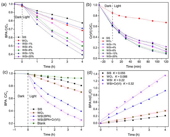 The photocatalytic performance of the photocatalysts was evaluated by the degradation of BPA and reduction of Cr(VI), respectively, under visible light irradiation. As shown in Figure 5a, the photocatalytic efficiency of the WSI heterojunction is significantly higher than that of pure SIS and WO3. Moreover, the photocatalytic degradation rate was calculated to evaluate the photocatalytic activity. The photocatalytic degradation rate fitted well with the pseudo-first-order kinetics. As shown in Table 1, the photocatalytic rate constant of BPA degradation by WSI-12% was estimated to be 0.2135 h−1, which was 2.5 and 3.8 times that of WO3 and SIS, respectively. For the reduction of Cr(VI), the apparent rate constant of WSI-12% was 6.5 and 1.5 times that of WO3 and SIS, respectively. The enhanced photocatalytic activity can be attributed to the favorable band alignment between WO3 and SIS, which forms a direct S-scheme heterojunction that greatly improves the separation of charge carriers in the two-phase interface. Hence, the construction of the S-scheme heterojunction shows great potential as an efficient photocatalyst for simultaneous oxidation of BPA and reduction of Cr(VI).