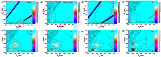 Three-dimensional fluorescence spectra of BPA-degraded production at different illumination times: (a) Blank–0 h; (b) Original solution–0 h; (c) 1 h; (d) 3 h; (e) 6 h; (f) 9 h; (g) 12 h; (h) 24 h.