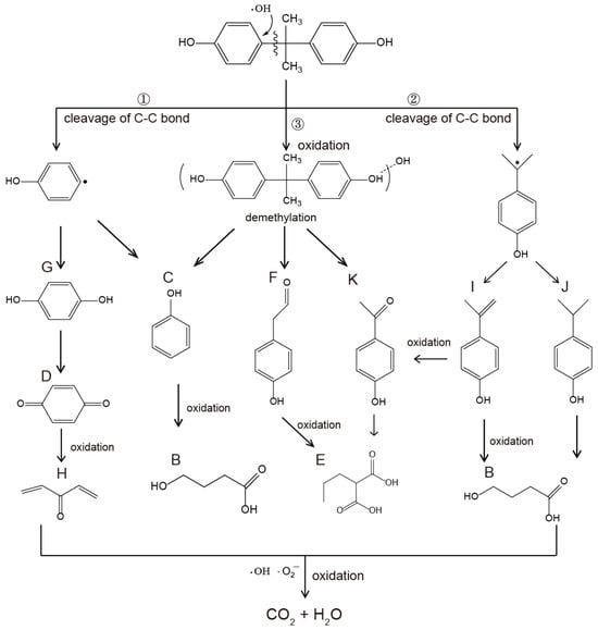 To further deepen our understanding of the photocatalytic degradation process, GC/MS was conducted to identify the degradation intermediates of BPA after 4 h of irradiation. Figure S2 displays the MS spectra of the intermediates observed during the photocatalytic oxidation reaction. Table S1 summarizes the main fragment ions (m/z) and abundance (%) of reaction products in comparison to the NIST data library. As shown in Figure S1 and Table S1, the chromatogram and mass spectrum of the BPA degraded intermediate were listed in the order according to the retention time. The intermediates were as follows: 4-hydroxy butyric acid(B), phenol(C), benzoquinone(D), 2-dipropylmalonic acid©, benzene acetaldehyde(F), hydroquinone(G), Penta-1,4-dien-3-one(H), 4-isopropenylphenol(I), 4-isopropylphenol(J) and p-Hydroxyacetophenone (K). Based on the detected intermediates and relevant literature reports, three possible degradation pathways of BPA were proposed, as illustrated in Figure 7 [38,39]. The first pathway is initiated by the cleavage of the C-C bond between phenyl groups and the central carbon atom and leads to the formation of a phenol radical and an isopropylphenol radical. In Pathway 1, hydroxyl radicals (·OH) attack the C-C bond between phenyl groups and the central carbon atom, leading to the formation of the phenol radical and isopropylphenol radical. Some of the phenol radicals can further oxidize to produce hydroquinone (G) and benzoquinone (D), while another portion of the phenol radicals is quenched to form phenol (C). The isopropylphenol radical undergoes additional transformation, resulting in the formation of 4-isopropenylphenol (J) and 4-isopropylphenol (I), with the latter being oxidized to p-Hydroxyacetophenone. The phenol products continue to oxidize, breaking the benzene ring and forming smaller molecules, such as 4-hydroxybutyric acid, Penta-1,4-dien-3-one, ultimately leading to their complete oxidation into CO2 and H2O. Another potential degradation pathway involves the direct oxidation and demethylation of BPA, resulting in the formation of phenol (C), benzene acetaldehyde (F), and p-Hydroxyacetophenone (K), which subsequently degrade into low-molecular-weight organic acids. The hydroxyl radical is the major active radical involved in decomposing the benzene ring due to its strong oxidation properties. In this work, we demonstrated that the redox potential of photogenerated holes was enhanced by constructing the WSI heterojunction and that BPA could be oxidized by ·OH and mineralized into low-molecular-weight organics.