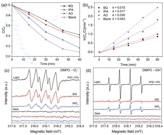 Effect of scavengers on the degradation of BPA over WSI-12%: (a) photocatalytic efficiency and (b) degradation rate, ESR signals of the (c) DMPO-·O2− and (d) DMPO-·OH of WSI-12% photocatalyst.