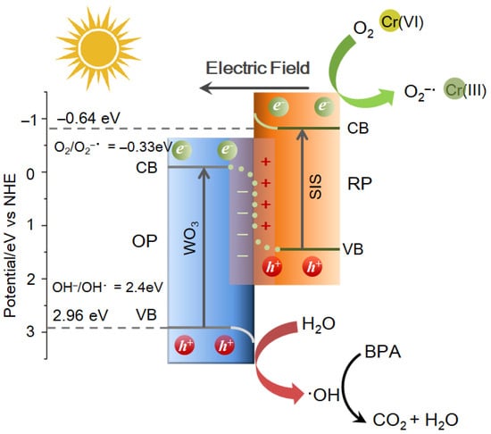 Based on the above results and analysis, a possible S-scheme mechanism of WSI-12% was proposed, as shown in Figure 9. The CB and VB redox potentials of WO3 were +0.13 V vs. NHE and +2.96 V vs. NHE, respectively. The SIS photocatalyst, with a redox potential of −0.64 V vs. NHE (CB) and +1.44 V vs. NHE (VB), could couple with WO3 to form the direct S-scheme system, due to the more negative CB potential. The redox potential between the VB of SIS and the CB of WO3 is 1.31 V, which facilitates the transfer of the photogenerated electron to the VB position of SIS. Under visible light irradiation, the photogenerated electron of the WSI-12% S-scheme system transfers from the CB of WO3 to the VB of SIS and recombines with the hole of SIS. Therefore, the electron on the CB position of SIS and the hole on the VB position of WO3 are spatially separated, increasing the probability of reaction with reactants. The VB potential of WO3 is larger than the oxidization potential of water to hydroxyl radicals (·OH/H2O = 2.4 eV vs. NHE), while the CB potential of SIS is more negative than the reduction potential of oxygen to superoxide radicals (·O2−/O2 = −0.33 eV vs. NHE). The ·OH and ·O2- radical generated by the photo-introduced holes and electrons of the WSI S-scheme system can oxidize the refractory organics to low-molecular organics, and the photogenerated electrons can reduce the Cr(VI) to Cr(III). Hence, the S-scheme system can simultaneous oxidize organic and reduce heavy metal ions. The major reaction steps of the S-scheme mechanism under visible light irradiation are summarized in the following reactions:
